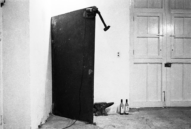 Acrilico/pared, acero sobre techo, martillos, motores, sensor de movimiento, texto/ pared ("I am the walrus" The Beatles).