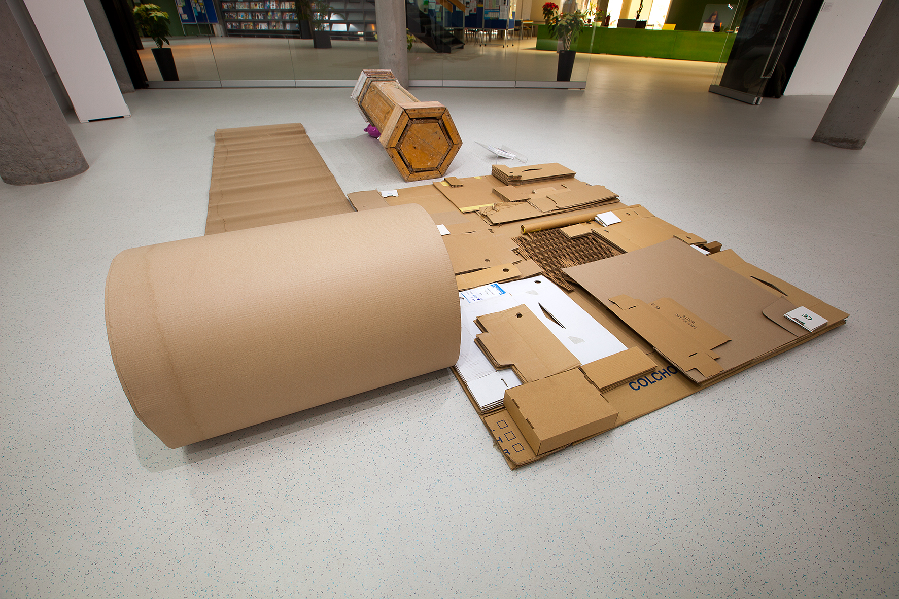 Cardboard, kraft paper, book, church pedestal and balloons.
